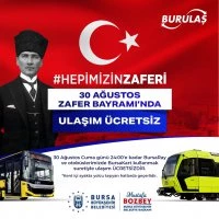 Bursa Büyükşehir Belediyesi tarafından 30 Ağustos Zafer Bayramı kutlama ve etkinliklerinin coşkulu kalabalıklarla yapılabilmesi için BursaRay, Burulaş otobüsleri ve tüm Özel Halk otobüslerinde 30 Ağustos Cuma günü saat 24.00’a kadar ulaşımın ücretsiz olacağı belirtildi. Ücretsiz uygulamadan yararlanmak için vatandaşların ulaşım kartlarını kullanmaları gerekirken, uygulama kent içi ayakta yolcu taşıyan hatlarda geçerli olacak.