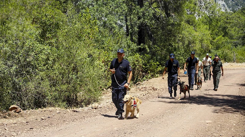 Orman yangınlarında kullanılmak üzere özel olarak yetiştirilen hassas burunlu yangın tespit köpekleri de Antalya İl Jandarma Komutanlığı asayiş birimleri tarafından alan taramada kullanılıyor.