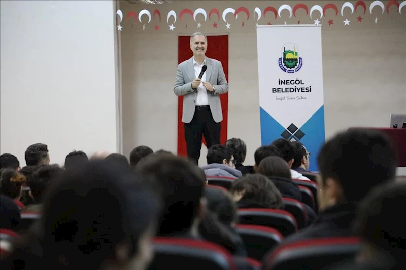 Kampüsün çok amaçlı salonunda okulların 11 ve 12’nci sınıf öğrencileriyle bir araya gelen Başkan Taban, gençlere tavsiye ve önerilerde bulundu. Aynı zamanda İnegöl Belediyesi’nin gençlere yönelik çalışmaları ve hizmetlerini anlatırken öğrencilerden de talep ve önerilerini iletmelerini isteyen Belediye Başkanı Alper Taban, kariyer planlamasının önemine de değindi.