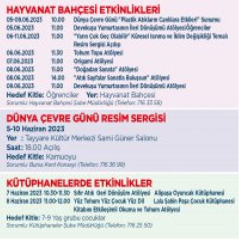 Özellikle okulların son haftaları olması nedeniyle daha çok öğrencilerin katılımına yönelik etkinlikler ve atölyeler gerçekleştirilecek. Sağlık İşleri Dairesi Başkanlığı Hayvanat Bahçesi Şube Müdürlüğü’nün organizasyonu ile 5-9 Haziran tarihleri arasında Hayvanat Bahçesi'nde "Plastik Atıkların Canlılara Etkileri" Sunumu, 5 ve 9 Haziran’da ‘Deve Kuşu Yumurtasının İleri Dönüşümü’ atölyesi, 6-11 Haziran "Yarın Çok Geç Olabilir" Küresel Isınma ve İklim Değişikliği Temalı Resim Sergisi Açılışı, 6 Haziran Tohum Topu Atölyesi, 7 Haziran Origami Atölyesi, 8 Haziran "Doğadan Sanata" ve "Atık Sayfalar Sanatla Buluşsun" atölyesi yapılacak. Kültür ve Sosyal İşler Dairesi Başkanlığı Kütüphaneler Şube Müdürlüğü’nün organizasyonu ile Alipaşa Oyuncak Kütüphanesi’nde 7 Haziran’da ‘Sıfır Atık Geri Dönüşüm Atölyesi, Lala Şahin Paşa Çocuk Kütüphanesi’nde 8 Haziran’da “Yüz Tohum Yüz Çocuk Yüz Dil Kitabını Etkileşimli Okuma ve Tohum Atölyesi” gerçekleştirilecek.