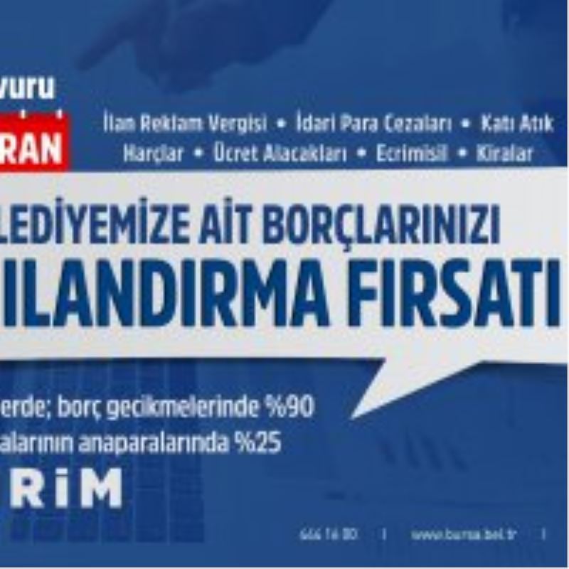 BURSA – 7440 Sayılı Bazı Alacakların Yeniden Yapılandırılması ile Bazı Kanunlarda Değişiklik Yapılmasına Dair Kanun kapsamında Bursa Büyükşehir Belediyesi’ne vadesi 31 Aralık 2022 tarihi ve öncesi borcu bulunan mükelleflere borçlarını yapılandırma fırsatı sunuluyor. Son başvuru tarihi 7300 sayılı Cumhurbaşkanlığı kararı ile 30 Haziran 2023’e kadar uzatılan yapılandırma kapsamında borçların peşin ödemesi halinde, gecikme faizinde yüzde 90 oranında indirim sağlanmasının yanında ayrıca 48 aya kadar taksit imkanı sunuluyor.