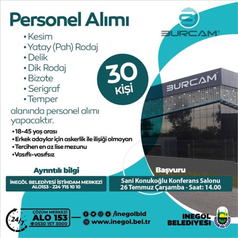 İş arayan ve işvereni buluşturan İnegöl Belediyesi İstihdam Merkezi, Burcam firmasının farklı alanlarda toplam 30 personel alımı yapacağını duyurdu.