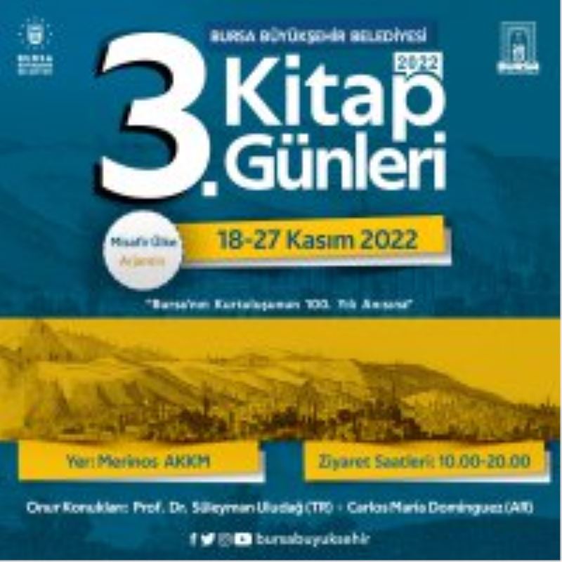 ‘Herkes için her yerde kültür sanat’ parolası ile kültürel faaliyetleri Bursa’nın tamamına yayan Bursa Büyükşehir Belediyesi, Kitap Günleri’nin üçüncüsünü 18-27 Kasım 2022 tarihleri arasında Atatürk Kongre ve Kültür Merkezi’nde düzenleyecek. Kitapseverlere 10 gün boyunca adeta kültür şöleni yaşatacak etkinlik, Bursa’nın düşman işgalinden kurtuluşunun 100. yılına atfedildi. Ayrıca 2022 Türk Dünyası Kültür Başkenti olması münasebetiyle Türk dünyasından yazarların da etkinliğe gelmesi öngörülüyor.