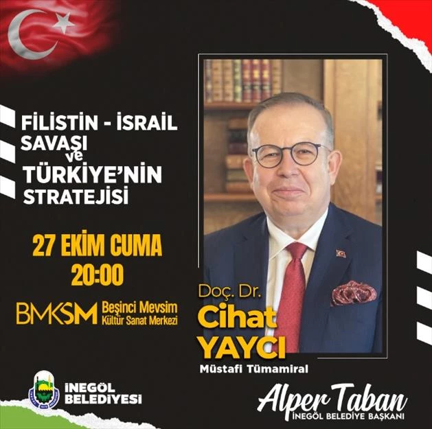 İnegöl Belediyesi’nden yapılan açıklamada; “Filistin’de yaşananlar ve ülkemizin bu noktadaki politikaları hakkında vatandaşlarımıza bilgilendirmelerin yapılacağı Filistin-İsrail Savaşı ve Türkiye’nin Stratejisi seminerinde, Türkiye’nin yetiştirdiği değerlerden biri olan Müstafi Tümamiral Doç. Dr. Cihat Yaycı ilçe halkımızla buluşacak. Cuma akşamı 20.00’da Beşinci Mevsim Kültür Merkezinde yapılacak programa tüm ilçe halkımız davetlidir” ifadelerinde yer verildi.