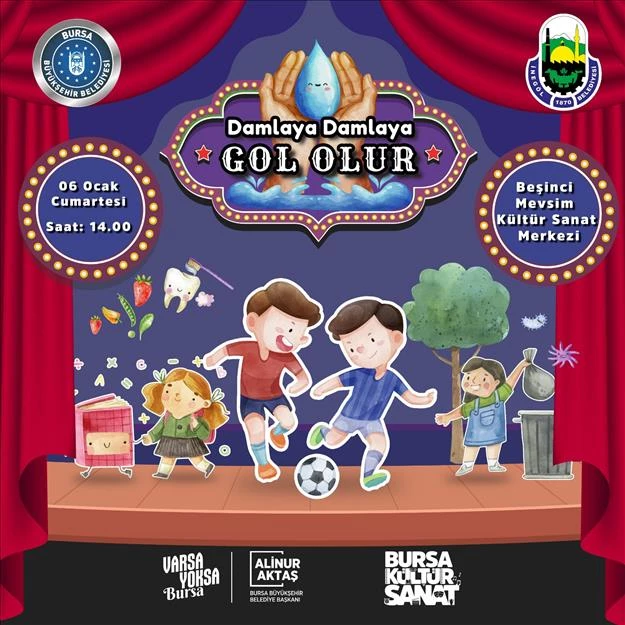 Bursa Büyükşehir Belediyesi Şehir Tiyatrosunun sahneye taşıyacağı “Damlaya Damlaya Gol Olur” isimli çocuk tiyatro oyunu, Cumartesi günü 14.00’da Beşinci Mevsim Kültür Sanat Merkezinde minik izleyicileri ile buluşacak. Ücretsiz gösteriye 6-12 yaş arası çocuklar katılabilecek.