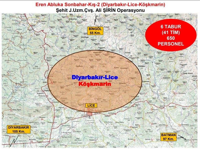 PKK Terör örgütünü ülke gündeminden çıkarmak ve bölgede barındığı değerlendirilen teröristleri etkisiz hale getirmek maksadıyla, Diyarbakır İlinde “Eren Abluka Sonbahar-Kış-2 (Diyarbakır-Lice- Köşkmarin) Şehit J.Uzm.Çvş. Ali ŞİRİN Operasyonu” başlatıldı.