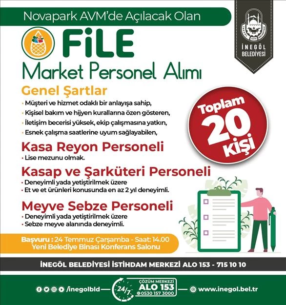 İnegöl Belediyesi İstihdam Merkezinden yapılan açıklamada, File Market firmasında çalışmak üzere 3 ayrı alanda 20 personel alımı yapılacağı duyuruldu. Açıklamada şu ifadelere yer verildi: “İstihdam Merkezimizle iş birliği yapan File Market firması, kasa reyon görevlisi, kasap ve şarküteri personeli, meyve sebze personeli alımı yapacak.’’