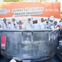 Bursa’nın sahip olduğu zengin mutfak kültürünü turizme kazandırmak ve dünyaya açmak amacıyla Büyükşehir Belediyesi tarafından ‘Damağımdaki Bursa’ temasıyla düzenlenen 3. Gastronomi Festivali, birbirinden renkli rekor denemeleri ve yarışmalara da sahne oluyor. Bursa Aşçılar Derneği’nin katkılarıyla Merinos Parkı’nda Bursa’nın coğrafi işaretli tatlısı olan ‘Süt Helvası’ ile rekor denemesi gerçekleştirildi. Türkiye’nin farklı kentlerinden Bursa’ya gelen 150 civarında şef, devasa kazanın başına geçerek tek seferde 5 ton süt helvasını yapmak için çalıştı. Kazanın altındaki ateşi yakan Bursa Büyükşehir Belediye Başkanı Mustafa Bozbey, eşi Seden Bozbey ile birlikte kazanın başına geçerek dev tahta kepçelerle süt helvasını karıştırdı. İlk tadımı eşi Seden Bozbey ile birlikte yapan Başkan Mustafa Bozbey, daha sonra alanı dolduran misafirlere ikramda bulundu. Rekor denemesinde emeği geçen tüm şefleri tebrik eden Başkan Bozbey, “Şeflerimiz, bu sene 5 son süt helvası yaptı. Önümüzdeki senelerde daha fazlasını yapacaklardır. Bursa’nın coğrafi işaretli tatlısı olan süt helvası, mutlaka Guinness Rekorlar Kitabı’nda yer almalıdır. Dev kazanda yapılan süt helvasını Merinos Parkı’nda ve Kent Meydanı’nda 20 bin kişiye ikram edeceğiz” dedi.