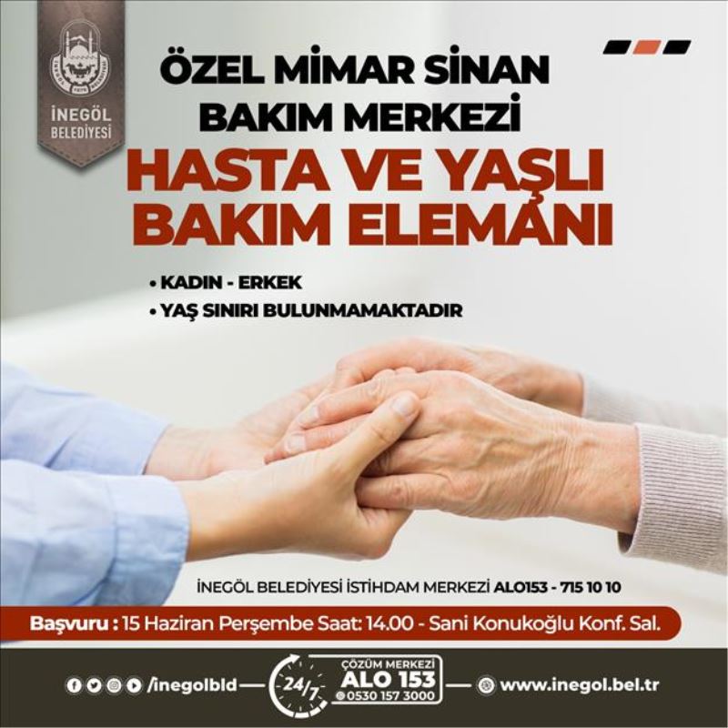 İnegöl Belediyesi İstihdam Merkezinden yapılan açıklamada, hasta ve yaşlı bakım işinde çalışmak üzere personel alımı yapılacağı duyuruldu. İstihdam Merkezimi ile iş birliği yapan Özel Mimar Sinan Bakım Merkezi yaş şartı aranmaksızın kadın ve erkek personel alımı yapacak.