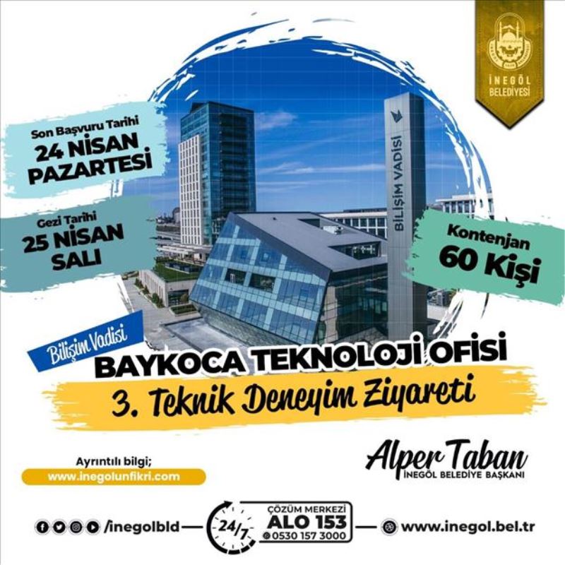 İnegöl Belediyesi’nden yapılan açıklamada, Bilişim Vadisi Baykoca Teknoloji Ofisi 3. Teknik Deneyim Ziyaretine katılmak isteyenlere çağrıda bulunuldu. 25 Nisan Salı günü yapılacak gezi için 24 Nisan Pazartesi gününe kadar başvuru yapılabileceği belirtildi. 60 kişi kontenjanlı geziye katılmak isteyenlerin http://inegolunfikri.com/inegolunfikri/projeler/teknik-deneyim-ziyareti-basvuru-formu adresinden online başvuru formunu doldurmaları yeterli.