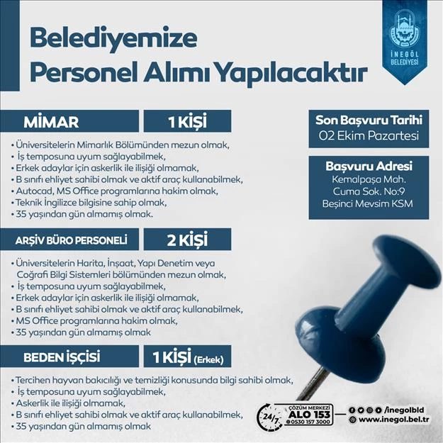 İnegöl Belediyesi’nin personel alımına ilişkin yapılan açıklamada şu ifadelere yer verildi: “Kurumumuz bünyesinde istihdam edilmek üzere 3 ayrı alanda görevlendirilecek personel alımı yapılacak. İlçe halkımıza en iyi hizmeti sunmak adına yapılan alım kapsamında; 1 mimar, 2 arşiv büro personeli ve 2 erkek beden işçisi istihdam edilecek. Başvuruda bulunmak isteyen vatandaşlarımız 02 Ekim Pazartesi günü 17.00’a kadar Kemalpaşa Mahallesi Cuma Sokak No:09 adresinde Beşinci Mevsim Kültür Sanat Merkezi zemin katında bulunan İnegöl Belediyesi Personel Hizmetlerine bizzat başvuru yapabilecek.