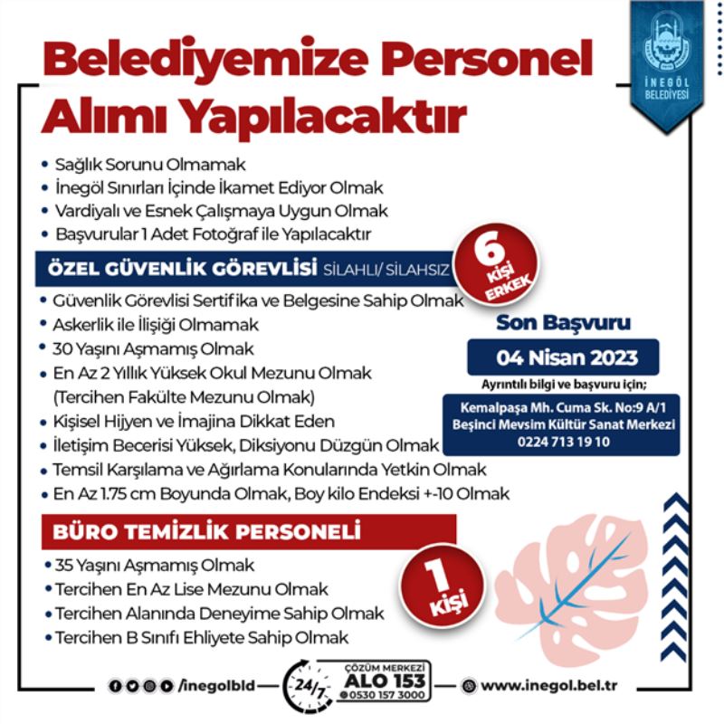 İnegöl Belediyesi, özel güvenlik görevlisi ve büro temizliği alanında çalışacak 7 personel alımı yapılacağını duyurdu. Son başvuru 04 Nisan 2023 olarak açıklandı.
