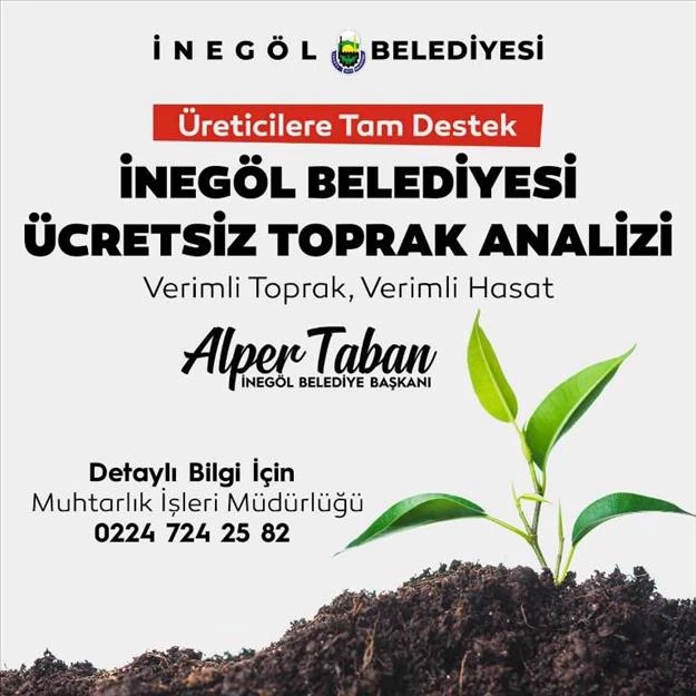İnegöllü vatandaşlara her alanda desteğini sürdüren İnegöl Belediye Başkanı Alper Taban uygulama hakkında bilgiler verdi. Başkan Alper Taban, ‘’İnegöl Belediyesi olarak çiftçimizin her zaman yanındayız. Teknolojik yatırımlarla üreticimizi doğru ürüne yönlendirmek ve toprağın değerini ölçümlemek adına ücretsiz toprak analizi uygulamamıza devam ediyoruz. Cerrah Ek Hizmet Binamızda yer alan Muhtarlık İşleri Müdürlüğü’müze getirilen numuneler üretici ve tarla-bahçe bilgileri alınarak analiz yaptırılmak üzere laboratuvara gönderiliyor. Her üretici istediği kadar numune getirebilir. Bir sınırlama veya kısıtlama yok. Üreticilerimizin gelirken numunenin ait olduğu tarla-bahçeye ait tapu bilgilerini getirmesi yeterli olacaktır. Analizler İnegöllü üreticilerimiz için ücretsiz olarak belediyemiz tarafından yaptırılacaktır.” dedi.