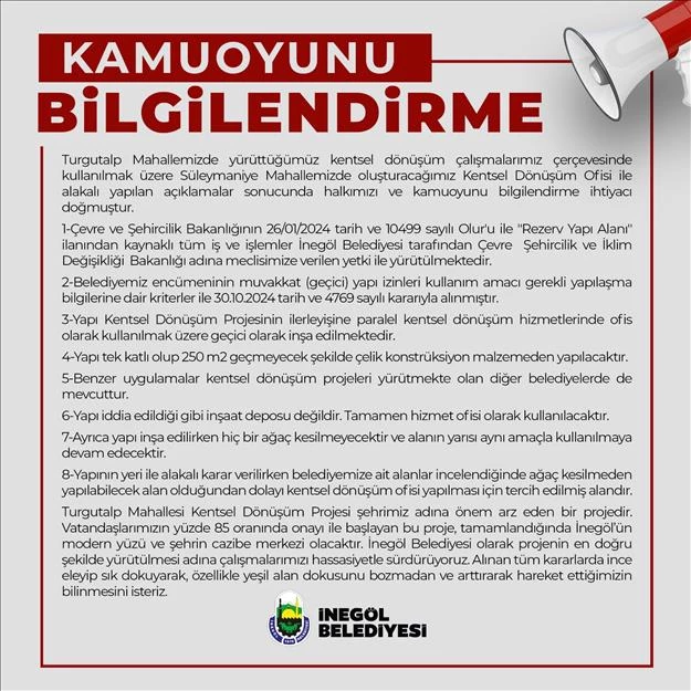 İnegöl Belediyesi, Turgutalp Mahallesi Kentsel Dönüşüm Projesi kapsamında oluşturulacak olan Kentsel Dönüşüm Bilgilendirme Ofisinin yerine dair kamuoyunda gündeme gelen iddiaların ardından yazılı bir açıklama yaparak konuya açıklık getirdi. Açıklamada şu ifadelere yer verildi: