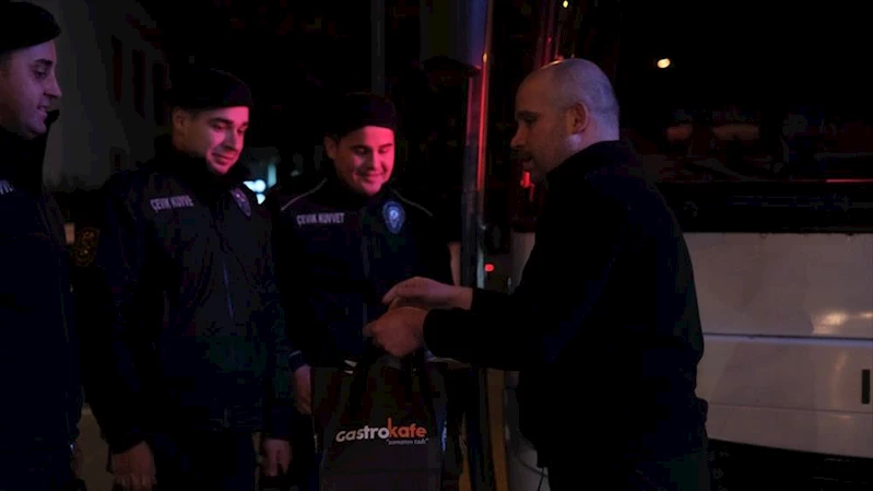 Sürpriz ikramlarla karşılaşan görevli polis memurları da yapılan jest