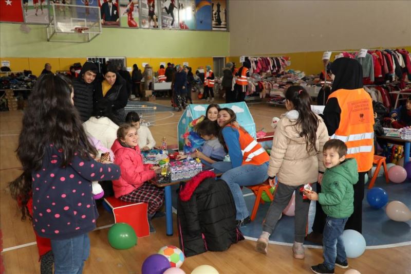 Alanda aynı zamanda çocuklar için de çeşitli etkinlikler hazırlandı. Aileleri ihtiyaçlarını karşılarken depremzede çocukların da felaket psikolojisinden bir an evvel çıkabilmeleri için İnegöl Belediyesi Şehir Tiyatrosu ekibi salonda oyun ve etkinlik alanları oluşturdu. Burada çocuklar da keyifli anlar yaşayarak depremin etkisinden kurtulmaya çalışıyor.