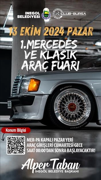İnegöl bu hafta sonu özel bir etkinliğe ev sahipliği yapmaya hazırlanıyor. 1. Mercedes ve Klasik Araç Fuarı İnegöl Belediyesi destekleriyle Mercedes Benz Club Bursa tarafından 13 Ekim Pazar günü Merpa kapalı Pazar yerinde gerçekleştirilecek. Bu organizasyon, 15 dolayında farklı şehirden gelen Mercedes tutkunlarının İnegöl’deki ilk kapsamlı buluşması olurken, fuarda 300’ü aşkın araç bulunacak. Ayrıca araç parça satışı yapan firma stantları da kurulacak.