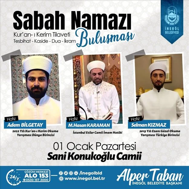 İnegöl Belediyesi, 01 Ocak 2024 Pazartesi sabahı özel bir buluşma gerçekleştirecek. Yeni yılın ilk gününde Sani Konukoğlu Camisinde; 2022 yılı Kuran-ı Kerimi Okuma Yarışması Dünya 1’incisi Hafız Adem Bilgetay, 2019 yılı Ezanı Güzel Okuma Yarışması Türkiye 1’incisi Hafız Selman Kızmaz ve Hafız M. Hasan Karaman’ın katılımıyla sabah namazı buluşması yapılacak. Namaz sonrası ise ikramlar gerçekleştirilecek.