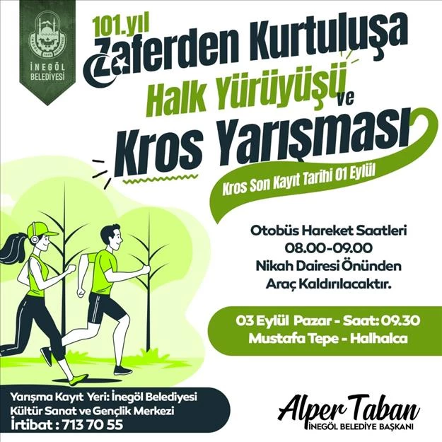 İnegöl Belediyesi, 6 Eylül İnegöl’ün düşman işgalinden kurtuluşunun 101. Yılı etkinlikleri kapsamında kurtuluş mücadelesinin verildiği dönemde en kanlı çatışmaların yaşandığı ve onlarca şehidin verildiği Mustafatepe’den Halhalca Şehitliğine halk yürüyüşü ve kros yarışması düzenliyor. Katılım için son başvuru tarihi 01 Eylül.