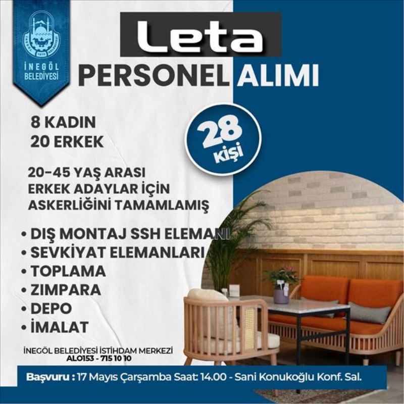 İş arayan ve işvereni buluşturan İnegöl Belediyesi İstihdam Merkezi, Leta Sandalye firmasının farklı alanlarda erkek ve kadın toplam 28 personel alımı yapacağını duyurdu.