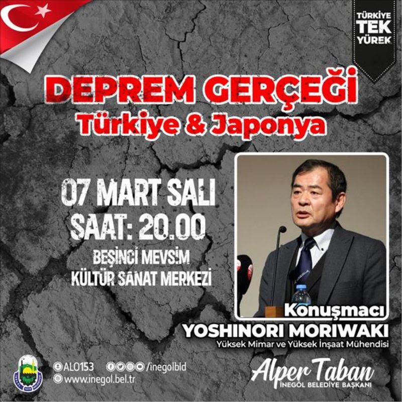 Kahramanmaraş merkezli yaşanan iki büyük deprem sonrası bir yandan deprem bölgesinin yaraları sarılırken, bir yandan da İnegöl Belediyesi şehirde deprem bilincini oluşturma adına çalışmalara başladı. Bu kapsamda “Deprem Gerçeği / Türkiye-Japonya” konulu bir seminer düzenlenecek. Seminerde Japon Yüksek Mimar ve Yüksek İnşaat Mühendisi Yoshinori Moriwaki ilçe halkıyla buluşacak.