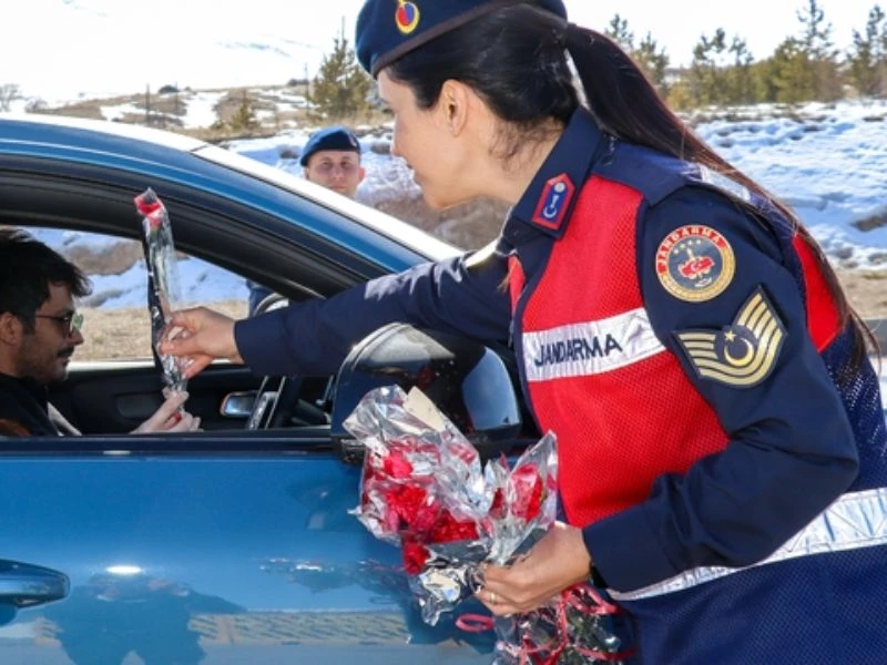 Kayseri Valiliğinden yapılan açıklamaya göre, İl Jandarma Komutanlığı Aile İçi Şiddetle Mücadele ve Çocuk Kısım Amirliği koordinesinde ekipler, 8 Mart Dünya Kadınlar Günü dolayısıyla Kayseri-Malatya kara yolu Pınarbaşı ilçesindeki yol kontrol noktasında durdurdukları araçlardaki kadınların gününü kutladı.