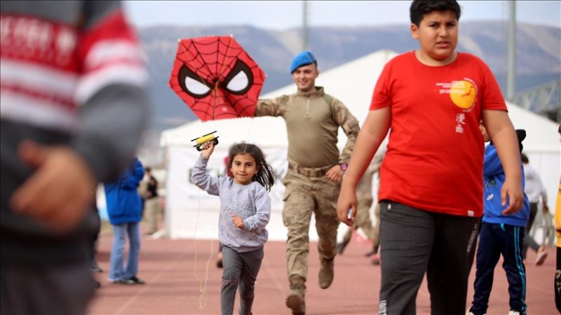 Depremlerin merkez üssü Kahramanmaraş'ta görev yapan Jandarma Komandolar, çadır kentlerdeki çocuklarla uçutma uçurdu.