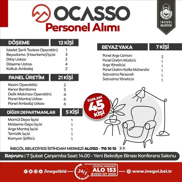 İnegöl Belediyesi İstihdam Merkezinden yapılan açıklamada, Hamzabey OSB’de üretimini sürdüren Ocasso firmasında çalışmak üzere 45 personel alımı yapılacağı duyuruldu. Açıklamada şu ifadelere yer verildi: “İstihdam Merkezimizle iş birliği yapan Ocasso firması; pek çok farklı departmanda görevlendirilecek mavi yaka ve beyaz yaka personeller alacak.