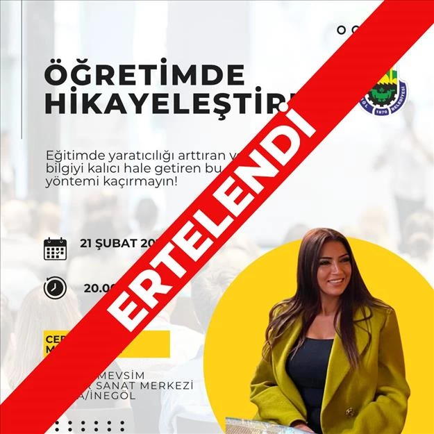 İnegöl Belediyesi’nin Ceren Güner Moghaddam’ın katılımıyla gerçekleştireceği “Öğretimde Hikayeleştirme” semineri hava muhalefeti nedeniyle ileri bir tarihe ertelendi.