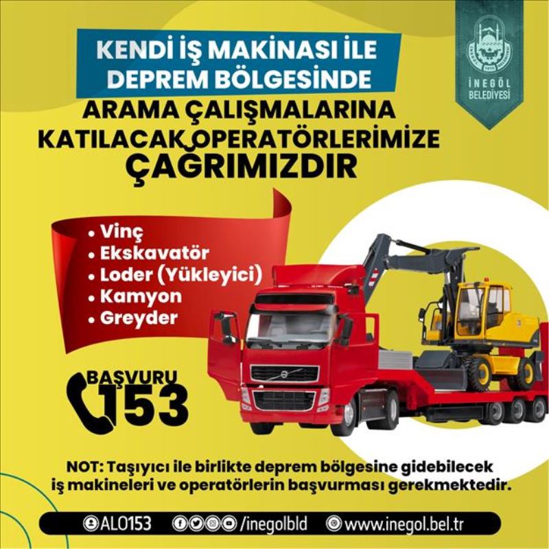 Kahramanmaraş’ta yaşanan deprem sonrası 10 ilde arama kurtarma çalışmaları sürüyor. Bu kapsamda İnegöl Belediyesi çalışmalara katılabilecek operatörlere ve iş makinası sahiplerine çağrıda bulundu. Yapılan açıklamada; vinç, ekskavatör, loder (yükleyici), kamyon ve greyder için kendi iş makinası ile deprem bölgesinde AFAD koordinasyonunda arama kurtarma çalışmalarına katılabilecek, aynı zamanda taşıyıcı ile birlikte deprem bölgesine gitme imkanı bulunan iş makinası ve operatörlerin 153 hatları üzerinden Çözüm Merkezine başvurmaları istendi.