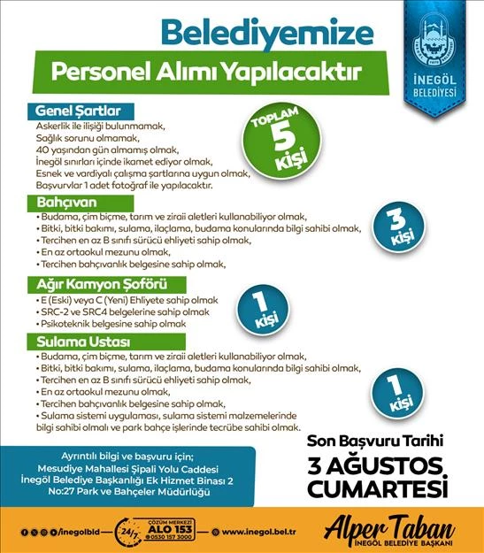 İnegöl Belediyesi’nin personel alımına ilişkin yapılan açıklamada şu ifadelere yer verildi: “Kurumumuz bünyesinde Park ve Bahçeler Müdürlüğü’nde istihdam edilmek üzere 3 ayrı alanda görevlendirilecek personel alımı yapılacak. İlçe halkımıza en iyi hizmeti sunmak adına yapılan alım kapsamında; 3 bahçıvan, 1 ağır kamyon şoförü, 1 sulama ustası istihdam edilecek. Başvuruda bulunmak isteyen vatandaşlarımız 03 Ağustos Cumartesi günü saat 13.00’ a kadar Mesudiye Mahallesi Şipali Yolu Caddesi İnegöl Belediye Başkanlığı Ek Hizmet Binası 2 No: 27 adresinde Park ve Bahçeler Müdürlüğü’ne bizzat başvuru yapabilecek.”