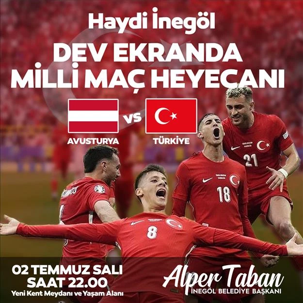 EURO 2024 Avrupa Futbol Şampiyonası kapsamında Milli Takımımızın son 16 turunda karşılaşacağı Avusturya maçı, İnegöl Belediyesi organizasyonuyla Yeni Kent Meydanı ve Yaşam Alanında dev ekranda izlenecek.