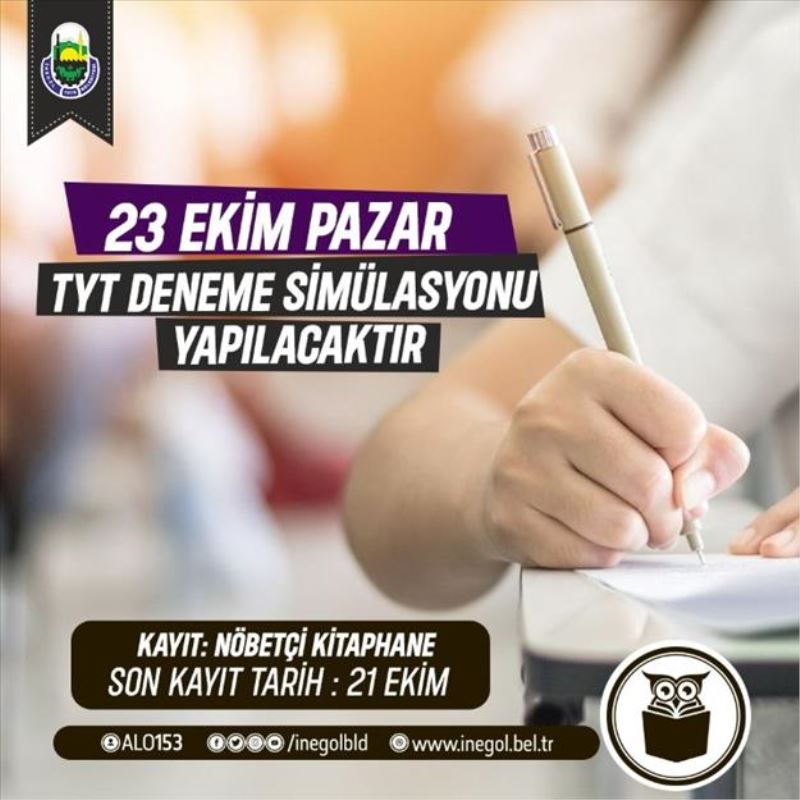 İnegöl Belediyesi, Nöbetçi Kitaphanelerde belirli aralıklarla yapılan sınav simülasyonları kapsamında 23 Ekim Pazar günü TYT deneme sınavı gerçekleştirilecek. Sınırlı sayıda kontenjanı bulunan sınav için başvurular 21 Ekim Perşembe günü sona erecek.