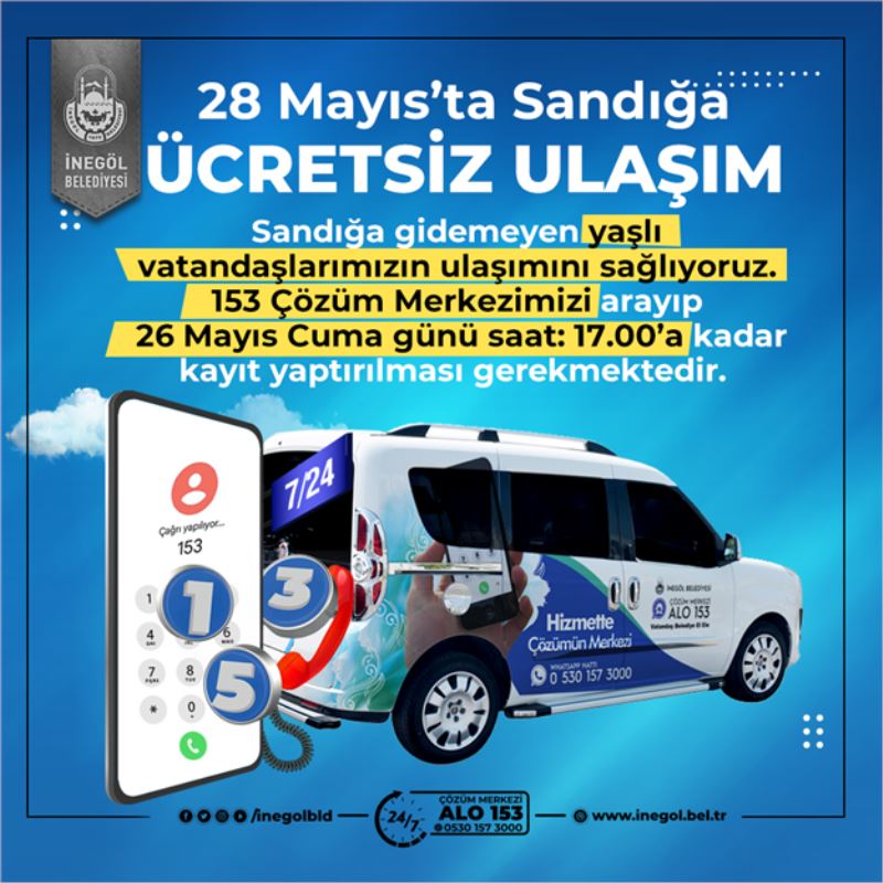 Konuya ilişkin açıklama yapan İnegöl Belediye Başkanı Alper Taban, “28 Mayıs Pazar günü ülkemiz Cumhurbaşkanlığı ikinci tur seçimleri için sandığa gidecek. Demokrasi şölenine sahne olmasını arzu ettiğimiz seçimlerde, tüm vatandaşlarımızın iradesini sandığa yansıtmasının önemli olduğunu düşünüyorum. Herkesin fikrini özgürce beyan ederek seçme hakkına erişmesi adına İnegöl Belediyesi olarak ulaşım desteği sağlayacağız. Sandığa kendi imkanlarıyla gidemeyecek durumda olan yaşlı vatandaşlarımıza ücretsiz ulaşım desteği vereceğiz. Bu hizmetten faydalanmak isteyen vatandaşlarımızın 26 Mayıs Cuma günü 17.00’a kadar 153 Çözüm Merkezimizi arayarak kayıt yaptırması ve randevu oluşturması gerekiyor. Sandığa iradesini yansıtmak isteyip imkanları el vermeyen tüm yaşlılarımızı 153 Çözüm Merkezimize kayıt yaptırmaya davet ediyorum” dedi.