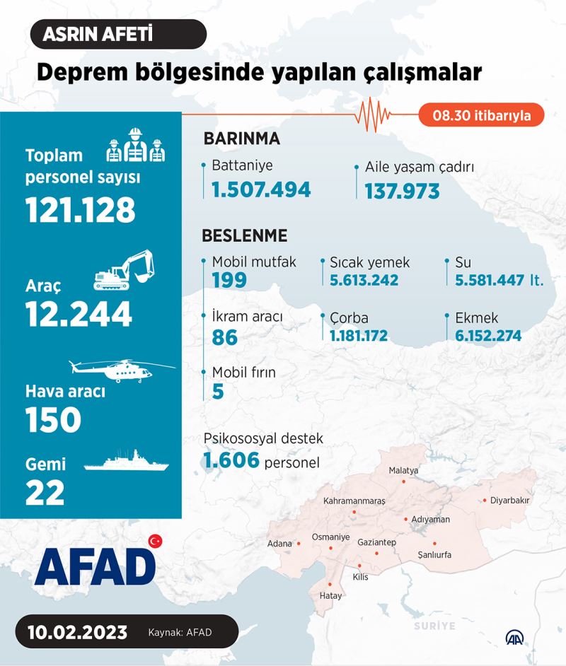 AFAD, Emniyet, Jandarma, MSB, UMKE, ambulans ekipleri, gönüllüler, yerel güvenlik ve yerel destek ekiplerinden görevlendirilen saha personel sayısı ile beraber bölgede görev yapan personel sayısı 121 bin 128'e ulaştı.